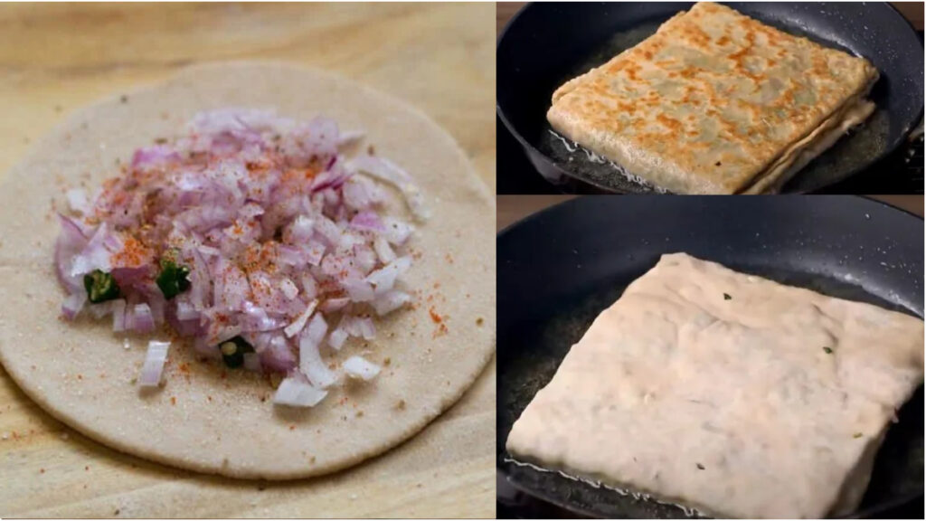 चौथी पायरी- तसेच प्रत्येक थरामध्ये तेल लावा. यामुळे नाश्ता कुरकुरीत होईल. आता त्यावर थोडं तेल लावून त्यात तयार केलेला नाश्ता टाका आणि शॅलो फ्राय करा. गॅसची आच मध्यम ठेवा आणि तेल लावून कुरकुरीत होईपर्यंत शिजवा. रोटी पराठ्यासारखी तपकिरी रंगाची झाल्यावर गॅसवरून काढून टाका.