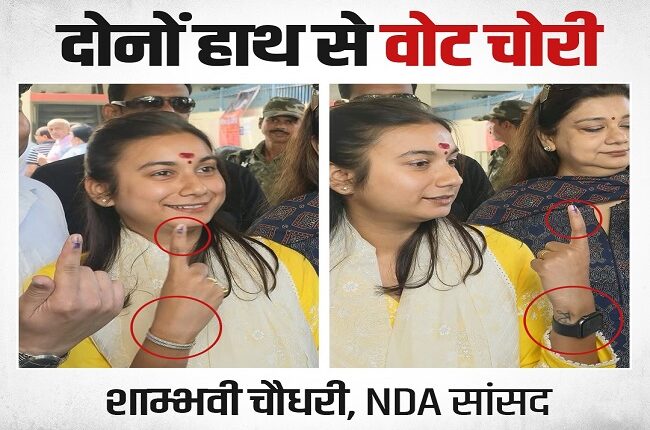 पाटणा. समस्तीपूर (बिहार) लोकसभा मतदारसंघातील लोक जनशक्ती पार्टीच्या लोकसभा खासदार शांभवी चौधरी मतदानानंतर कॅमेऱ्यासमोर पोज देत होत्या. यावेळी शांभवी चौधरी हिच्या दोन्ही हातावर शाई दिसली. म्हणजे त्यांनी दोनदा मतदान केले. ही बाब उघडकीस येताच त्याचे वडील अशोक चौधरी त्याला डोळ्याचे इशारे देऊन सांगत होते. लोकांनी निवडणूक आयोगाला विचारले, हे सर्व कसे चालले आहे? याची चौकशी कोण करणार?
