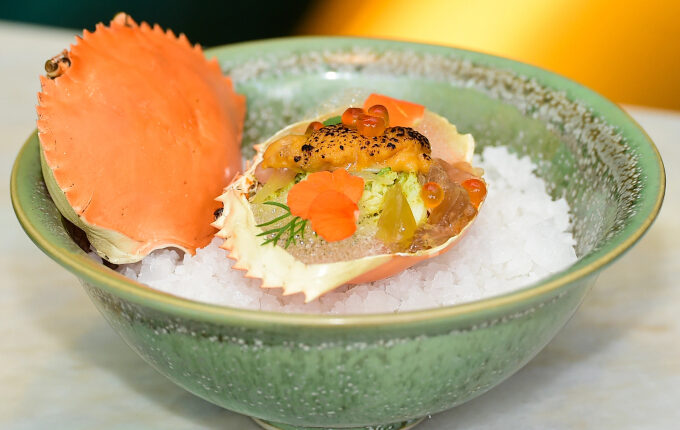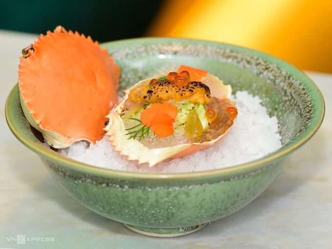हो ची मिन्ह सिटीमधील अनन सायगॉन येथे, खेकड्याला सी अर्चिन, रेड पोमेलो, तळलेले शॉलॉट्स आणि कोळंबीच्या डोक्यापासून बनवलेले सॉस यासारख्या घटकांसह जोडले जाते. VnExpress/Thanh Tung द्वारे फोटो
