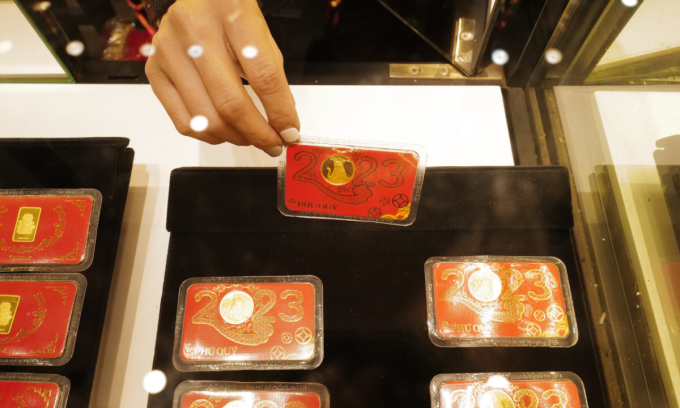 हनोईमधील एका दागिन्यांच्या दुकानात एका व्यक्तीकडे सोन्याचे नाणे आहे. वाचा/Ngoc Thanh द्वारे फोटो