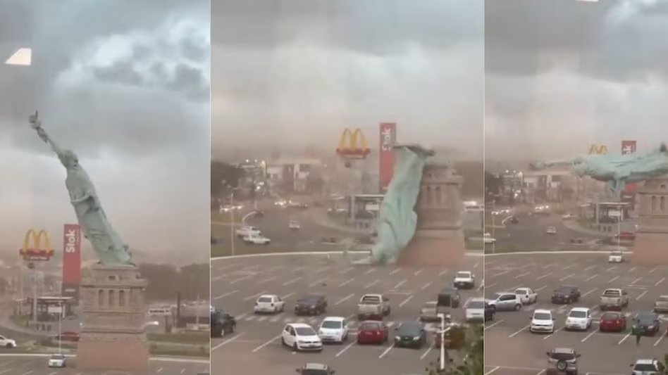 नवी दिल्ली. ब्राझीलमधील रिओ ग्रांदे डो सुल राज्यातील गुआबा शहरात रविवारी जोरदार वादळामुळे 'स्टॅच्यू ऑफ लिबर्टी'ची प्रतिकृती कोसळली. हेवन रिटेल कंपनीच्या मेगास्टोअरबाहेर ही प्रतिकृती बसवण्यात आली होती. या घटनेचा व्हिडिओ सोशल मीडियावर मोठ्या प्रमाणात व्हायरल होत आहे. व्हिडीओमध्ये स्पष्टपणे दिसत आहे की ताशी 90 किलोमीटर वेगाने वाहणाऱ्या जोरदार वाऱ्यामुळे ही प्रतिकृती प्रथम हळू हळू पुढे वाकते आणि नंतर रिकाम्या पार्किंग परिसरात पूर्णपणे पडते. दिलासा देणारी बाब म्हणजे प्रतिकृतीचा 11 मीटर उंचीचा पाया पक्का आहे.