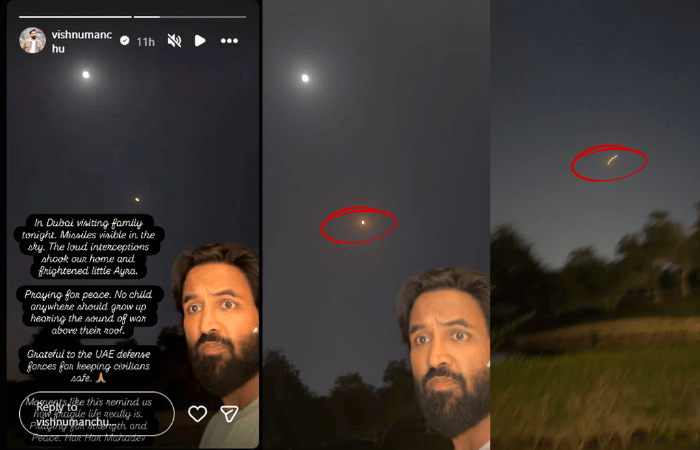 दरम्यान मिळालेल्या माहितीनुसार, प्रसिद्ध दाक्षिणात्य अभिनेता आणि निर्माता विष्णू मांचू यावेळी आपल्या कुटुंबासह दुबईत आहे. त्याने सोशल मीडियावर एक व्हिडिओ शेअर करत तेथील भयावह परिस्थितीची माहिती दिली आहे. विष्णूने सांगितले की, रात्रीच्या वेळी आकाशात क्षेपणास्त्रे उडताना दिसत होती आणि त्यामुळे आजूबाजूच्या परिसरात अनेक स्फोट झाले. या स्फोटांची तीव्रता इतकी जास्त होती की, यामुळे त्याचे घर अक्षरशः हादरले. या भीषण आवाजामुळे त्याची छोटी मुलगी आयरा प्रचंड घाबरली आहे. आपल्या मुलीला अशा परिस्थितीत पाहणे कोणत्याही वडिलांसाठी अत्यंत वेदनादायी असल्याचे त्याने म्हटले आहे.