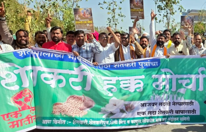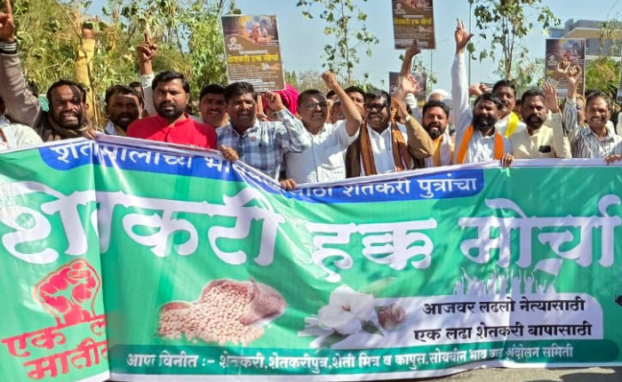 मुख्यमंत्री देवेंद्र फडणवीस होश मे आओ, उपमुख्यमंत्री पवार-शिंदे होश मे आओ म्हणत बीड जिल्ह्यातल्या शेतकर्‍यांच्या पोरांनी आज गुरूवारी शेतीमालाच्या भावासाठी रस्त्यावर उतरून आक्रोश केला. कापसाला किमान १२ हजार रूपये तर सोयाबीन ७ हजार रूपये, तुरीला १२ हजार रूपये भाव द्यावा म्हणत छत्रपती शिवाजी महाराज चौकापासून शेतकर्‍यांनी जिल्हाधिकारी कार्यालयावर मोर्चातून कूच केली. शेतकर्‍यांनी विविध मागण्यांचे फलक हाताने फडकावत जिल्ह्यातील शेतकर्‍यांची दयनीय अवस्था त्या फलकातून दाखवण्याचा प्रयत्न शेतकरी आंदोलनकर्त्यांकडून झाला. अतिवृष्टीने शेतातील पिके उद्धवस्त झाली. जी हाताशी आली त्याला भाव नाही. त्यामुळे संतापलेल्या शेतकरी पुत्रांनी शेतकरी हक्काचं अस्त्र उगारत हा मोर्चा काढला. या मोर्चासाठी जिल्हाभरातील विविध पक्ष, संघटनेचे कार्यकर्ते, पदाधिकारी यांच्यासह शेतकरी संघटनांचे पदाधिकारी व शेतकर्‍यांनी सहभाग नोंदवत आपला आक्रोश आज बीडच्या रस्त्यावर नोंदवला.