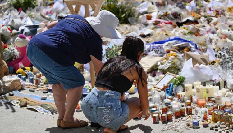 सिडनीमधील बोंडी बीचवर बोंडी पॅव्हेलियनच्या बाहेर लोक पुष्पांजली अर्पण करतात