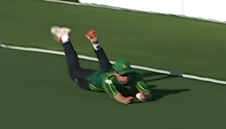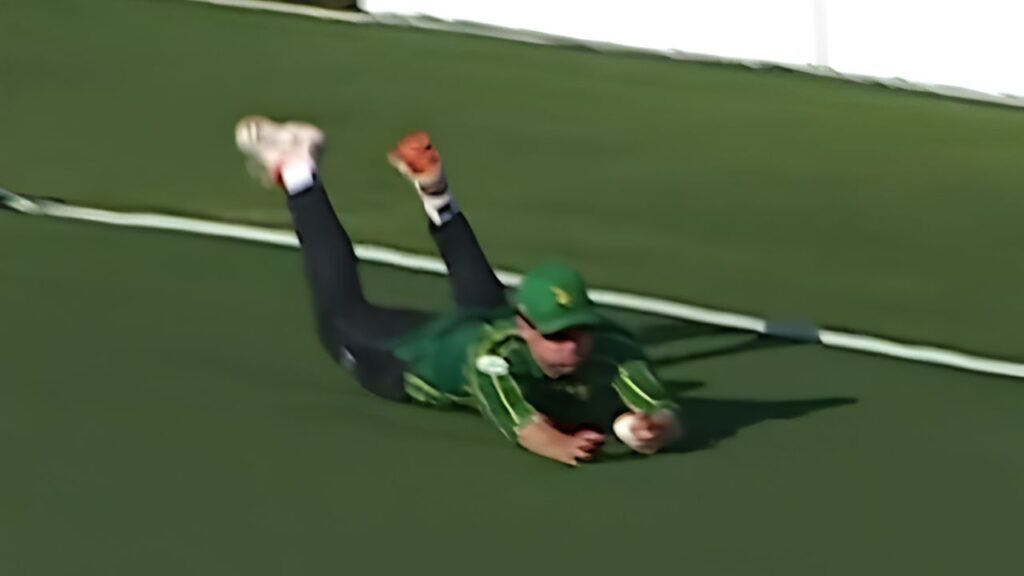 विल यंग डीप मिड-विकेटवर होता. चेंडू वेगाने खाली आल्याने तो झटपट आत गेला. अचूक निर्णयासह, यंगने स्वतःला पुढे फेकले आणि संपूर्ण स्ट्रेच डाइव्ह पूर्ण केले. बॉल टर्फपासून इंच इंच लांब होता पण तो जमिनीच्या अगदी वरती स्वच्छपणे पकडण्यात यशस्वी झाला.