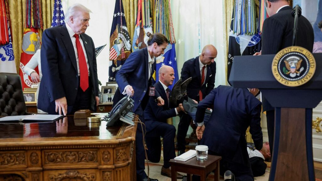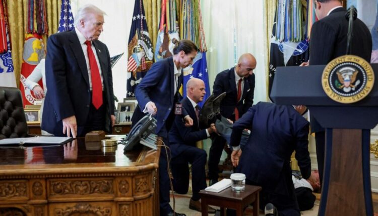 काही क्षणांनंतर, व्हाईट हाऊसच्या प्रेस सेक्रेटरी कॅरोलिन लेविट यांनी उपस्थितांना सांगितले की तो माणूस ठीक आहे.