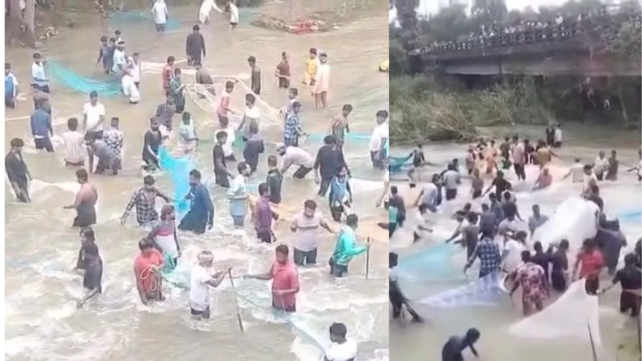 मोठ्या संख्येने लोक खाली मासेमारी करीत आहेत