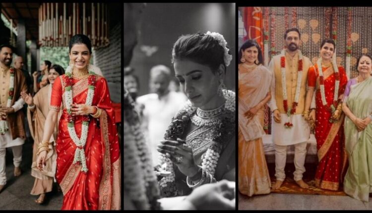 इतर अनेक फोटोंमध्ये सामंथा हसताना आणि लाजताना दिसत आहे. तिचे काही एकल पोर्ट्रेट आणि स्पष्ट शॉट्स तिला लाल साडीत, स्वप्नाळू नवविवाहित व्हिब्स दाखवतात.
