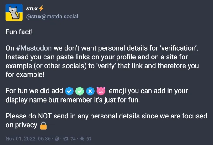 काही सर्व्हर अधिकृततेपेक्षा कमी प्रमाणात पडताळणी करण्याच्या कल्पनेने मजा करत आहेत. उदाहरणार्थ, mstdn.social सर्व्हर तुम्हाला निळे-पांढरे चेकमार्क जोडू देतो आणि तुम्हाला हवे असल्यास तुमच्या डिस्प्ले नावावर इतर इमोजी, जे तुम्हाला पडताळलेले दिसतील, जरी याचा काहीही अर्थ नाही. (ट्विटरच्या नवीन पडताळणी प्रणालीप्रमाणेच! पण विनामूल्य!)