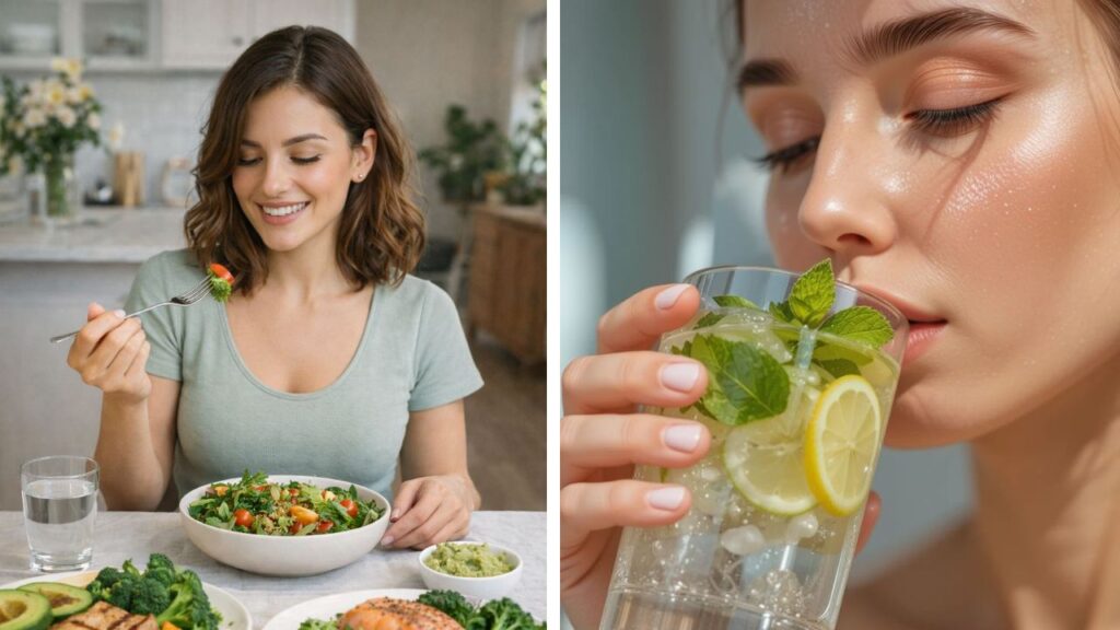 - कोमट पाणी, फळे, अंकुरलेले धान्य आणि नैसर्गिक रस त्वचेला ऊर्जा आणि चमक देतात.