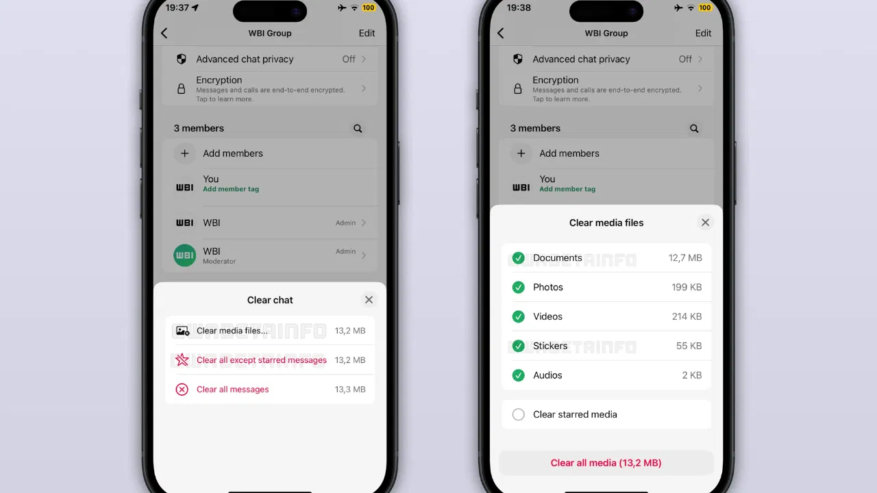 अशी अद्यतने विस्तृत मीडिया व्यवस्थापन नियंत्रणे प्रदान करतात. सर्व फायली एकाच वेळी हटवण्याऐवजी वापरकर्ते प्रतिमा, व्हिडिओ, दस्तऐवज, ऑडिओ संदेश किंवा व्हॉइस नोट्ससह फायलींच्या वैयक्तिक श्रेणी निवडू शकतात. स्टिकर्स स्वतः काढणे आणि मजकूर संदेशांशी संवाद न साधता व्यस्त संभाषणे व्यवस्थित ठेवण्यात मदत करणे देखील शक्य आहे.