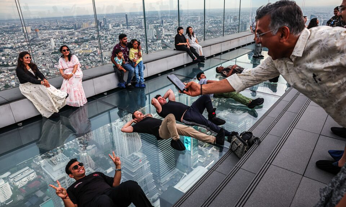 15 मे 2025 रोजी बँकॉक, थायलंड येथील महानखॉन इमारतीत महानखॉन स्कायवॉक रूफटॉपचा आनंद घेताना लोक पोज देतात. रॉयटर्सचा फोटो |
