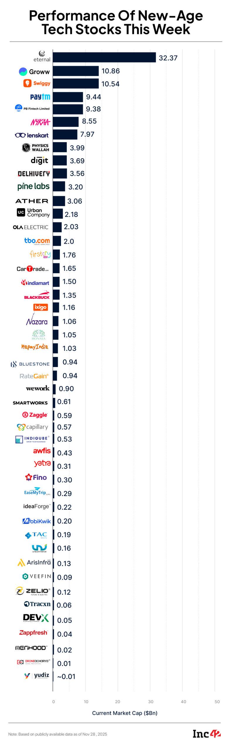 या आठवड्यात नवीन-युग तंत्रज्ञान समभागांबद्दल गुंतवणूकदारांची भावना संमिश्र राहिली, जरी व्यापक बाजाराने लवचिकता दर्शविली. 47 नवीन-युगातील टेक समभागांपैकी 29 0.17% ते 12% च्या श्रेणीत घसरून आठवड्याचा शेवट लाल रंगात झाला.